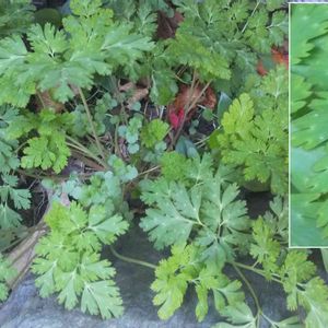 庭に数株生えています。日向に生えたものは全体が密で葉もくしゃくしゃとしています。写真は日陰に生えたもので、ゆったりと葉を茂らせています。一つの葉は3~5cmくらいで、全体の株径は30cmくらいあります。葉の凹部に白い模様が出ており、深い切れ込みや日向株のくしゃくしゃとした密な葉から、何かすごい花が咲くのではないかと思い様子を見守っております。