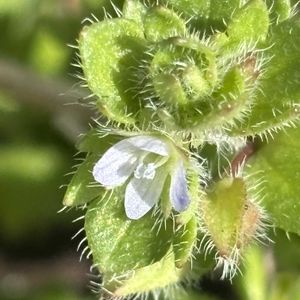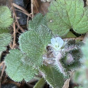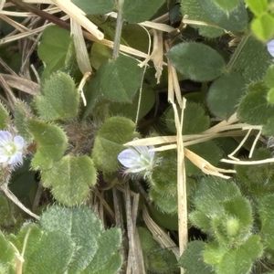 フラサバソウ オオバコ科クワガタソウ属 二年草 ヨーロッパ原産 別名はツタバイヌノフグリ 日本では明治初期に長崎県で初めて確認され、今では全国に帰化している。 道端などの草地に生える。 花期3〜5月 花弁は径4〜5mmで深く4裂する。 萼や゙茎、葉にも白い毛が多い。 花言葉は「一見こわもてに見える」