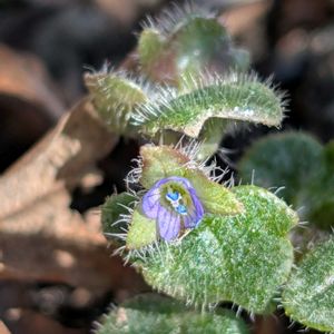フラサバソウ 別名 ツタバイヌノフグリ *オオバコ科クワガタソウ属 花期は2〜5月 ヨーロッパ原産の帰化植物で日本では、明治時代に長崎で確認され 現在では全国に分布! 畑や道端.林縁にはえる二年草! ①オオイヌノフグリと並んで咲いて 大きさが分かります! ハンノキの雄花が落ちていて 咲く時期の目安になります! ②毛の多さに驚きます! ③発芽直後の2枚の小葉には 鋸歯も毛もありません! 3月11日撮影