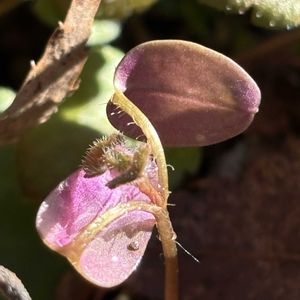 写真の①②③は先日の観察会で見たコゴメイヌノフグリの芽生えだと思います。 「だと思います」というのは ここはコゴメイヌノフグリが群生する所で説明もよく聞かないままコゴメイヌノフグリと早合点したので。 コゴメイヌノフグリは何度も見ていますが芽生えは初めてです。 面白い事に葉の裏側がピンクで綺麗なのです。 ③でも風や霜の当たりにくい側溝の中に生えているのは緑でした(左) この色は寒さによるものなのでしょうかね〜。 ④すでに日当たりの良い場所では花が咲きそうになっていました。 そこで、ふと思いついて ⑤フラサバソウが群生していた場所に行ってみると同じような双葉がたくさん♪ 上下で色が違うのはやはり寒さによる違いかと。 でも、コゴメイヌノフグリとの違いがよくわかりませんね。葉の鋸歯の数が少なそうなのでフラサバソウだと思います。 そこで気になったのがオオイヌノフグリの芽生え すでに庭では花が咲いています♪ そして庭に生えてくる時に双葉が出て来ていた記憶がありません。 この3つの芽生えの違いは自分の来年の宿題です(^^) 余談ですが、これらを調べている時に今では「双葉」や「本葉」って言わないそうなんですね「子葉」と「葉」 知りませんでした(^_^;)