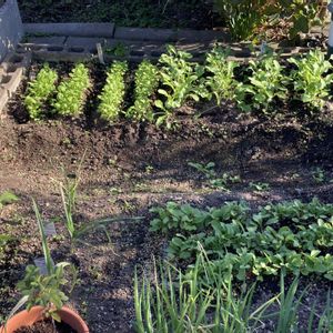 種まき野菜たち 小さなポタジェでも何とか育てています。 ①手前は九条ねぎ、二十日大根 奥はかつお菜と大根など ②プランターの中の葉大根(お漬物用) ③種まきしたつるなしスナップエンドウ