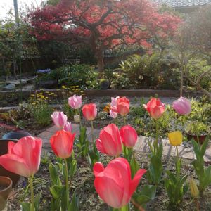 はじめて植えたチューリップがこんなに咲いてくれてうれしいです。 紅葉の葉っぱも芽吹いてきています。。