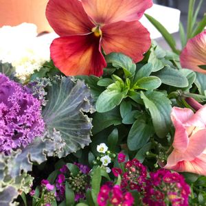 今朝の1枚 寄せ植え 昨年末の忙しい時期に、リニューアルした寄せ植え🌸🌼 左半分のビオラ、ネメシア、虹色スミレはそのままにして、右半分のセロシアなどの秋のお花を葉牡丹とパンジーに入れ替え😊 オレンジのパンジーが、もっと咲いたら嬉しいのになぁ。 このパンジー、とても綺麗な色で好き🧡🧡