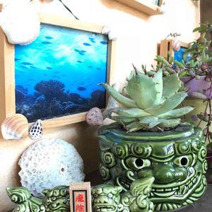 おはようございます☀🙋❗ シーサー祭ということで我が家のシーサーを😊☝ これは先週沖縄旅行に行ったムスメが ツアーで作ったシーサーです🎶 「お母さんお土産❗多肉の御守り〜」と置きました このコは女の子らしいです ブルーだから男の子と思っていたら 口を閉じてるのは女だよと言ってました😅 なんだかポケモンみたいでちょっと迫力ないですが😂 今日も1日いい日になりますように🍀