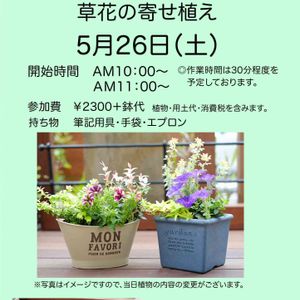 ゴールデンウイークも終わりましたね。 セールも大盛況でした。 ご来店の皆様、ありがとうございました。 さて、店内も落ち着いたところで・・・ ワークショップのご案内です! 5月26日(土)に草花の寄せ植えのお教室を開きます。 お時間はAM10時からとAM11時からの2回ございますので、ご都合の良い時間にご予約下さい。 鉢選びも楽しみですね♪ お気軽にお電話、もしくはご来店時にスタッフまでお問い合わせ下さい。 ご参加お待ちしております!(^^)
