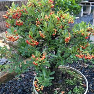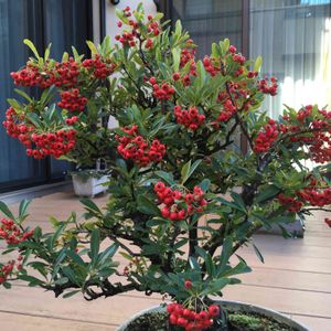 ピラカンサ ミニ盆栽、真っ赤になりました実が落ちたら大きい鉢に植えて上げます🤗