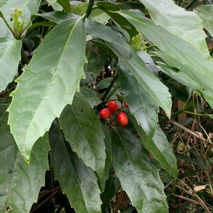 庭木のアオキ(青木)に赤い実がなってました。 実がなるのは雌の木のみです。