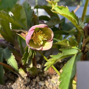 h. vesicarius クリスマスローズの原種 難物と言われているヴェシカリウスです。 初開花した昨年に続き、2年連続の開花🙌 実生11年生🍀 地味〜な花だけど、しっかりワイン色の帯が出ています。 昨年は2月末に開花したけど、今年は1ヵ月早く咲いたようです💓