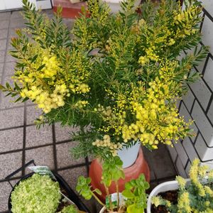 こんにちは☀ 昼休みにGETしてきました😆 アカシア【ミモザ】のテレサ🎵 矮性で樹高1m程度のようです。 狭い我が家では1mでも大きいので、鉢植えと剪定でコンパクトにしたいと思いますが やったことありません😅 これから花が咲くみたいなので、花後(5月頃)一周り大きい鉢に植え替える予定です。(現在は4号鉢) 枯らさないようにがんばるぞー‼️😃