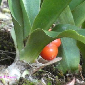 2021.11.30 撮影 オモト(万年青)の実を見つけました❣️ 2つ成ってる様です💕 ⬆️:2021.5.15 前庭のサツキかツツジとハクチョウゲの下の、前年成った透き通った実が残ってました ⬅️:2021.6.5 裏庭のオモトの花 旦那の草刈り機にやられました😭 ⬇️:2021.11.30 前庭の⬆️と同じ辺りにあります