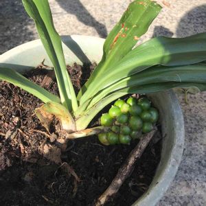 こんにちは😃 今日はこちら、風もなく 穏やかな晴天です オモトの実がだんだんと色ずんで きました! もう1鉢は相変わらずの姿です この鉢たちはもう何年も植え替え してなかったので来年は 植え替えです