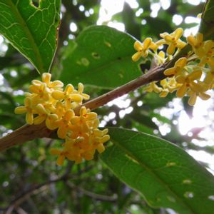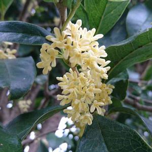 ウスギモクセイ(薄黄木犀) モクセイ科 20191017 東西南 銀モクセイの葉は縁が細かいギザギザで白花なので、見分けは容易だけれど、薄黄モクセイの認知度が低いので混同されている👀 (縁のギザギザが荒いのはヒイラギモクセイ) 金・銀・薄黄モクセイの花は食べられるそうで、中国のおもてなし料理には度々登場するそう(あんかけ等)🍴 金モクセイは香りが強く芳香剤な印象だけど、薄黄モクセイは香りが柔らかく、心地よい香水のよう😌
