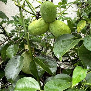 4月20日にお花の写真を投稿したムベに実がついていました。まだ青いですが、左側の写真は青空に向かって伸びる蔓の先に小さいですが2つ実がついてました。 これから実が大きくなり紫色になり、収穫できるのは秋と書いてあったので、まだまだ先ですね🤤。