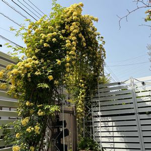 モッコウバラのアーチ 去年倒れたので、新しいのを作ろうかと思ったら、木材価格高騰🪵😱 足元やら折れたとこやらを補強して、とりあえずしのいでおります😂