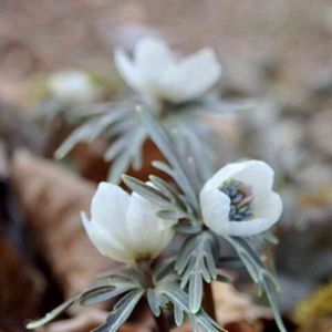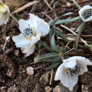 セツブンソウのソックリさん、ヒナマツリソウです。セツブンソウより花の時期が少し遅いのと、蜜腺の色と形、葉の形などが違います。去年よりも丸い感じで咲いてます。種まきで増やしてます。