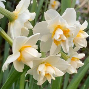 八重咲き日本水仙見つけました💛🤍💚 花の中央部分の副花冠の部分が多弁化している八重咲きの品種の房咲き水仙 雄しべが花弁化しているようですと書いていました 植物って不思議ですね