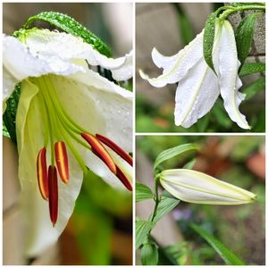 *百合(ユリ) カサブランカ オリエンタル ・ハイブリッドと いう園芸品種群の一つ。 特徴 : 真っ白な大輪、 スペイン語で ‘Casa blanca’ は「白い家」 花の内側に斑点が ほとんど無い。 茎が細く、大輪の 花は期待できない と思っていました が、今年も咲いて くれました🤍🧡🤍