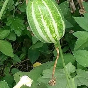 8月のカラスウリ坊🐗と②しぼみかけのお花 早朝です。 花も実もうり坊も可愛い☺️