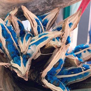 旅人の木の種。 鮮やかなダーコイズブルーは自然の神秘を感じさせてくれます。 ガラスドームに入れて飾ると素敵ですし、ホコリからも守れます◎