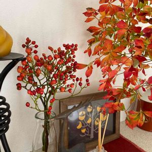 かわいい薔薇の実が手に入りました。 時間が経つと深い赤になっていきますが まだ新しいので朱色がかっています。 ドウダンと一緒に飾って秋満載。
