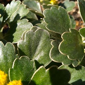 今日のお花🔸イソギク🔸 白い縁取りの葉が魅力です✨🤍💚🤍✨ 数年前に迎えた磯菊は、植えた場所が悪かったのか生育不良でヒョロヒョロになっています🥲 今年リベンジで小さな1株を迎え、日当たりの良い所に植えてみました💦🎶