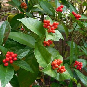 センリョウ(千両)の実がなっていました。 花は夏に白い花が咲き、実は11月~2月に、葉🌿の上に実🔴がつきます💕 正月にはまだ早いですが、正月🎍の縁起物です🎶😃