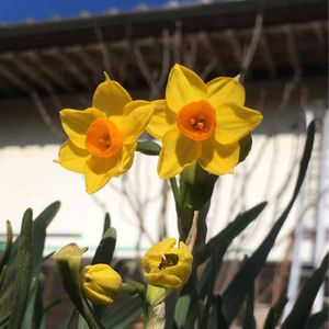 黄房水仙💛 実家で(旦那の)咲いてました じぃじに分けてもらったのが 家にもあるけど まだ花芽10cmぐらいにしか なっていません 日当たりはいいけど 冷たい風が当たるからかな