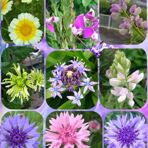 こんばんは✨🌛✨ 玄関周りや畑にいろんなお花が咲いてきました😊 左上から時計回りに、春菊の花、ポリガラ、矮性ルピナス薄紫、ビンク、矢車菊3色、カガリ弁咲ロレト、シラー・ペルビアナです✌️ 毎日色んな顔を見せてくれています、みんな綺麗に咲いてくれて嬉しいなぁ🥰
