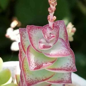 こんにちは☀️ 小さな肉厚の葉が高く積み重なった愛嬌のある数珠星 ロゼッタ状に咲く淡い黄緑色の葉に縁がピンク色が可憐 花芽が伸びてきました