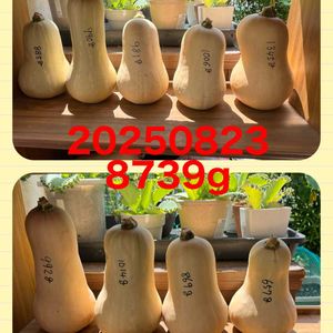 おはようございます。薄曇り、31.4℃、11:00ムシっと暑い。バターナッツかぼちゃ3世、今まで収穫、追熟中の9個の重量を測ってみたら8739gでした。日々草、109日目種採り開始。モロヘイヤ135日目収穫しました。😍🥰😻☺️😋😸