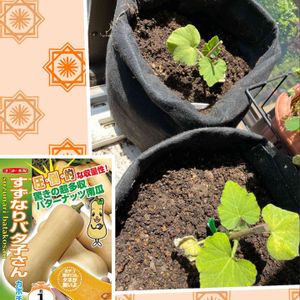 野菜部👩🌾 バターナッツカボチャ ミニ🎃 まだ10センチの赤ちゃん👶 蔓の勢いが凄い💦 何個できるか楽しみです🥰🎶