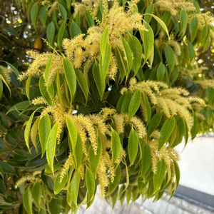 5/31㈮② ユカリさん発信🏷目に青葉2024〜 最終日に 4種目スダジイ 5枚で場所の違う3本のスダジイを載せてます。←何故か3枚に…😅 ①5/8遊歩道のスダジイ ②5/10新宿御苑のスダジイ ③御苑のスダジイの花 ④幹と名札、説明板 ③④が何故か外されました🥲 ⑤5/24市川万葉植物園の若木のスダジイ ①の遊歩道のスダジイにも若芽に花が咲いていました。 新しく伸びた枝先にだけ花がさくようです。 新宿御苑のスダジイは巨木でした。 樹の下に入って撮ったので暗いです。幹から左に枝を伸ばし、その枝も太くて立派でした。 市川万葉植物園のスダジイはたぶん花が終わった後。こじんまりした若木で可愛かったです。 椎の木なので、秋にはどんぐりが出来ますね😃 スダジイと濁るからお爺さんみたいですよね。菅田将輝君も将来は菅田爺…みたいな🤣🤣