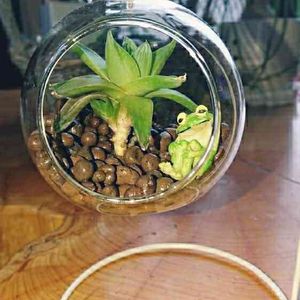 おはようございます(*^-^*) 雨凄かったぁ~っ☔ みなさん、被害はありませんでしたか? 今まだ雨が降っている所の方、どうぞお気をつけ下さい。 雨のせいで外の植え替え作業が出来なかったので、お家の中でこんなの作ってみました。 梅雨にはまだ早いけど、カエルちゃんの棲みか🐸🐸🐸 ハオルチアさんと共に。。。
