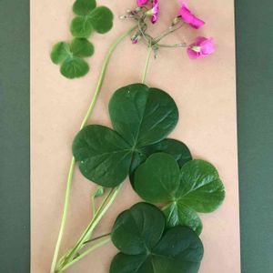 オキザリスの葉っぱを比べてみました。 花の横にあるのが普通の大きさです。 何倍あるでしょうか? 根っこごと抜けました。