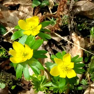キバナセツブンソウ (黄花節分草) 我が家🏡の 花壇の片隅で、ひょっこりはん・・・ 😙 南ヨーロッパ産で、地下深くに 塊茎(小球根)を 持っています 😊 学名を『エランティス・ヒエマリス』 もちろん、キンポウゲ科です 日本固有種の セツブンソウ(節分草)より 1ヶ月 遅れて、咲いてきます 😊 山野草・・と 言っていいのでしょうね 🥰 外来種ですが、一応 スプリング エフェメラル・・・😅 1枚目の 大きな葉っぱ🌿は、クリローの 葉っぱです 😂 🏷月曜日にビタミンカラー 🏷ちっちゃいものクラブ 🏷蕊好きマニア 🏷チームうずくまり 🏷小花妖精
