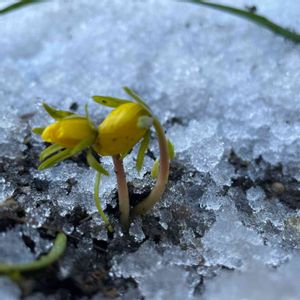 うちの2番目北側小さな庭より 昨年迎えた キバナセツブンソウ咲きました。まだ若干の雪ありますが顔を出してくれました やったー😊