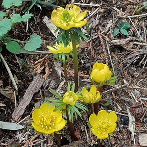 福寿草(フクジュソウ)と思ってたら、これはキバナセツブンソウでした。🙇 すみません😣💦⤵️ 2022年3月に写したものです 真ん中のはずいぶん伸びてますね😳
