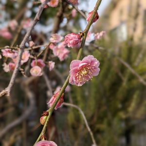 しだれ梅ピンクと、見えにくいですが…ご近所さんのお庭から〜綺麗に咲いています✨🩷🤍🩷🤍🩷💫🐝🦋