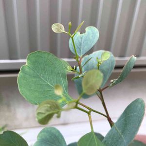 ユーカリ^_^随分と前の新入りですが、ポポラスを2回枯らせてしまったので、これは慎重に水遣りをしてます😅 この種類が不確かです。ポポラスのような気もします。 伸びてるような気がするので、元気なようです😅