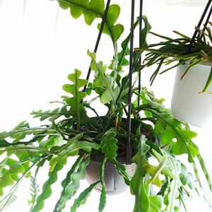 フィッシュボーンカクタス💕 (エピフィルム・アングリガー) (白眉孔雀) 垂らしたくなくて、ビニタイで固定。 お花はどの位育ったら咲くのかな?