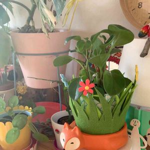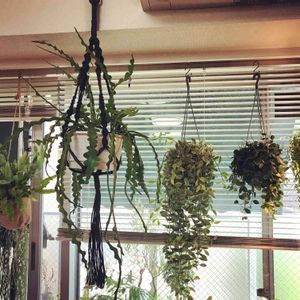 アングリガーはあたたかくなってめちゃくちゃ伸びてきた。 見た目はワカメみたいだけど、けっこう硬くて垂れ下がるより上にぐんぐん伸びてしまう。 可愛い鉢カバーに入れたけど、ハンギングだから軽いのがいい。 ボロっとした編み編みした麻みたいな布はどこに売ってるんだろ。あれで囲みたい。
