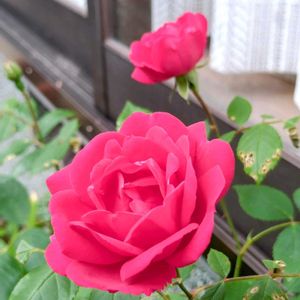 今朝の玄関先より ꕤ バラ シェエラザード ꕤ 今年も咲いてくれました💓 葉っぱをたくさんムシに食べられましたが、 お花はどうにか無事でした💦