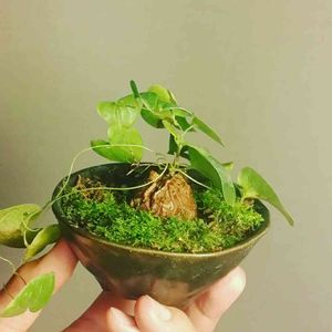 先日のサギソウが初めての草物盆栽と書きましたが、そういえばこの亀甲竜は下草になったりしないんでしょうかね? 多年草といえば多年草なので、草物に分類されると思いますし。 ということで、少しだけ盆栽っぽく植え替えてみました。苔も貼ってみましたが、およそ良くない組み合わせでしょうね😓 もっと間口の狭い小さな鉢に植えるとか、ツルが伸びるので、深い鉢に植えてだらんと垂らせば多少は風情もでるかも?
