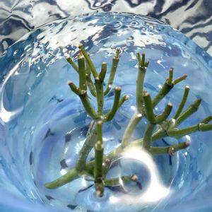珊瑚物語 ③猿恋茸は何年か前 ダイソーでサンゴのタグで売られていました。木質化どころか最早 木🌳です。 ①ムムム(⑉・̆-・̆⑉) 挿し木をしようと思って メネデール水にドボンしたら… ほんまにサンゴだった 🪸(~¯︶¯)~ 涼しげ〰️〰️∗*゚ ②ちょいと引っかけ、 ブラブラ珊瑚(~'ω' )~ ④フィッシュボーンカクタスもかなりワカメ感 ⑤お詫び ネットで調べたはずなのに … この前のボトルツリーの投稿、訂正します。新葉だった。新しい葉っぱ何回も見てたのに…おかしいなぁ🤔