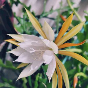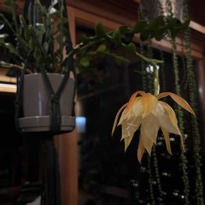 8年前、 花友さんからいただいた1枚の葉から育てたフィッシュボーンカクタスが、ついに今年花芽を上げました。 夜になると部屋中に甘く強烈な香りが広がり、まさに過去一の感動…! 冷える夜は家の中(トイレに移動中)でも香りが漂って、2階の部屋まで届いてびっくりです💫 ※葉挿しから8年かけて開花 →ココ強調🤣