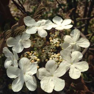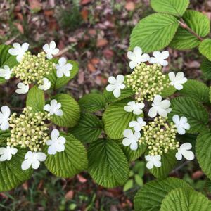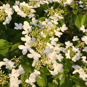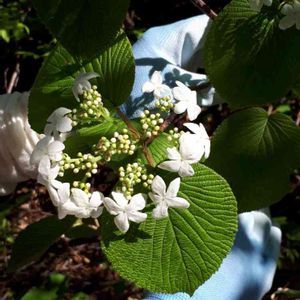 No.51 オオカメノキ 和名:大亀の木 別名:ムシカリ(虫狩) ガマズミ科ガマズミ属 周辺の白い花は装飾花で、実のならない不稔花🎵 中心にあるのが実のなる正常花🎵 秋には真っ赤な実をつけます🎵 別名は、葉が虫に食べられやすく、「虫喰われ」からの転訛といわれる☀️