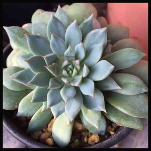 青い渚と何かの交配種。昨夏に傷んだ葉を取り除いて斜めに成長中です。新しい葉にはどうしても波打つような染みが出てしまうのは、交配によるエラーなのかウイルスなのか…。葉先が赤く色づいてかわいいのにー。
