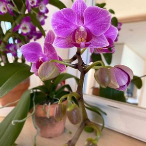 胡蝶蘭の開花1号‼️ すごくかわいくて嬉しいけど良く見ると花びらに変な模様が💦 横向きの花はふたつともリップの形も変 リップが無い花を咲かせたデンドロと一緒に置いてあったから、やっぱりウイルスなんだろうなぁ 悲しいけど処分しようと思います😥 最後にかわいい花を見てやってください