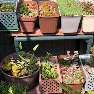 この台の上にはポリカ屋根はありません。 雨は外と同じだけ降ります。 台の有効利用でキッチリ置けるミニプランターを此処に集めています。 3月から植え直ししてきて、暫くは放っておいても大丈夫かな。