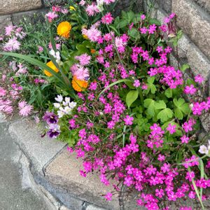 先程のコーナーのアップです‼️ヒゲナデシコの濃いピンクはお初でした❣️斑入りは薄いピンクとの交配かも⁉️きんせんかと、白い長いのはなんでしたっけ❓最近皆んな忘れてしまいます⁉️